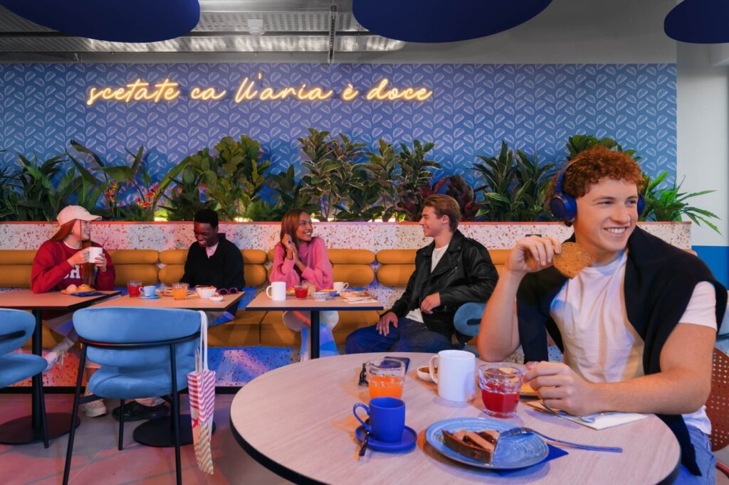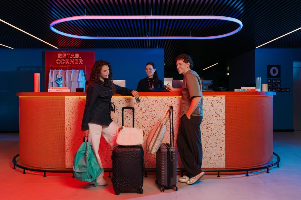 Located at Via Galileo Ferraris 4, just steps from Naples’ Centrale train station, this massive 15,000-square-meter building has been completely transformed from a former INPS (Italian social security) office into a modern hybrid hospitality hub. The €40 million investment has created something Naples has never seen before: a true 21st-century living space that blurs the lines between student residence, hotel, hostel, and creative workspace.